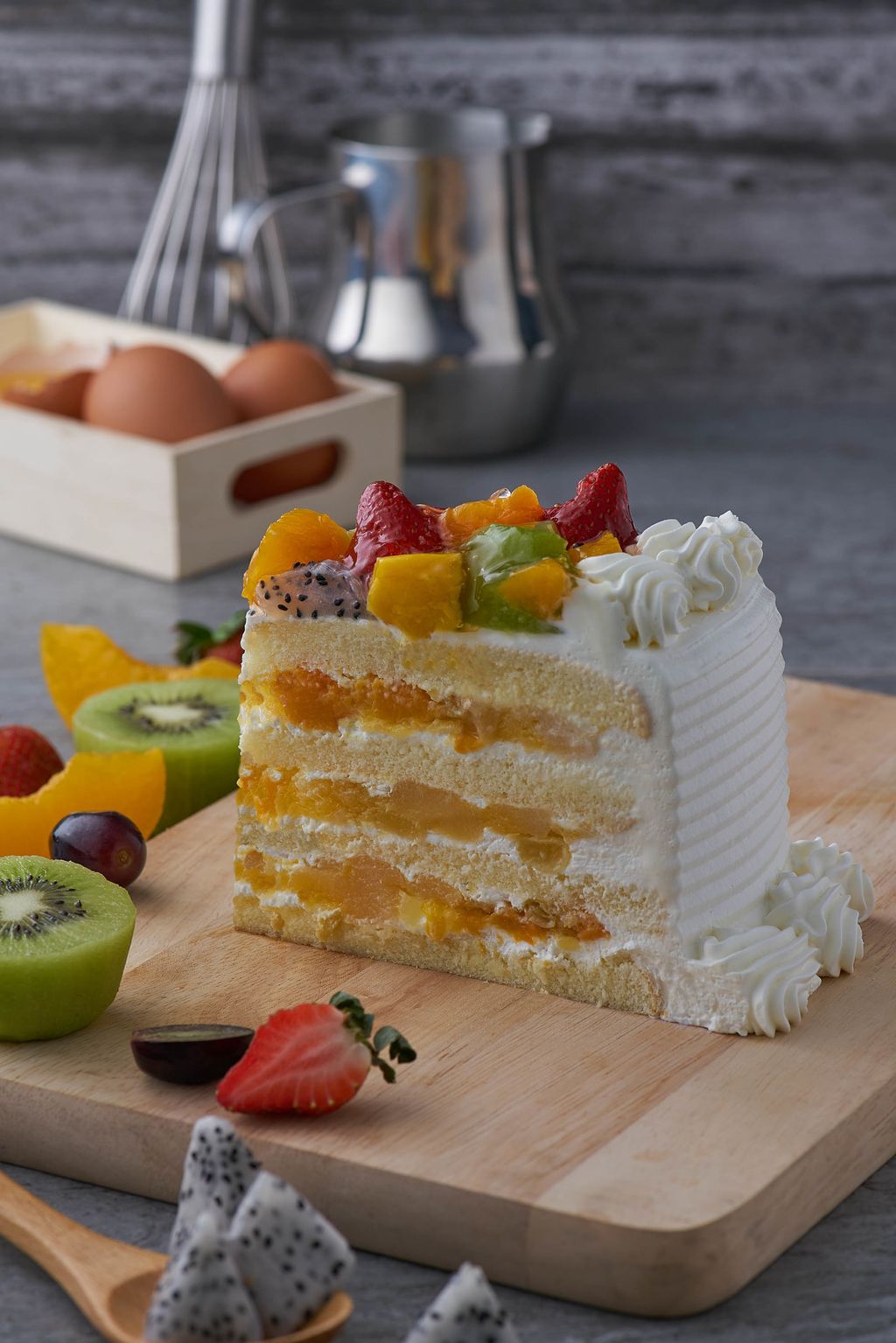 Indulge in this refreshingly fruity creation, with delicious pears, pineapple, peaches and grapes layered with fresh vanilla sponge and cream. Glazed and set perfectly for a bountiful presentation with a generous premium assortment of kiwis, strawberries, sweet grapes, mangoes, dragonfruits and peaches.